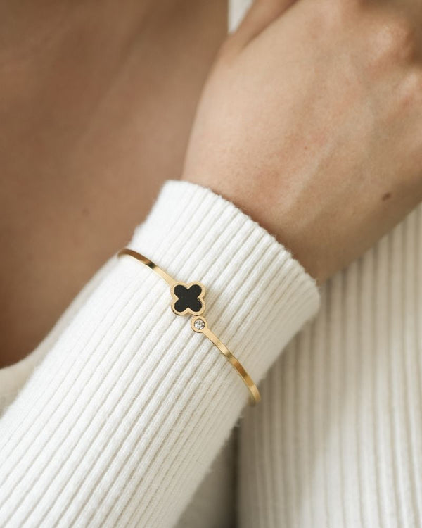 This bangle combines sleek cable details with alternating charms of black and white accents, complemented by sparkling crystal elements. The design exudes a refined yet contemporary style, perfect for adding a touch of elegance to any outfit. Lightweight and versatile, this bangle is ideal for both everyday wear and special occasions.